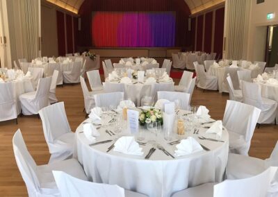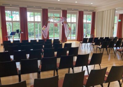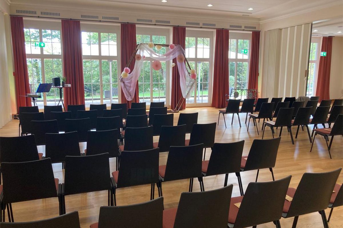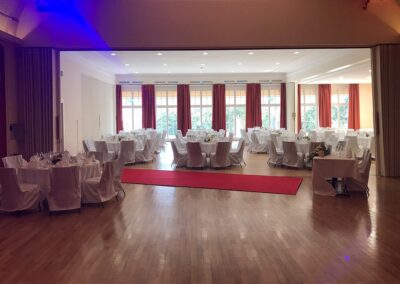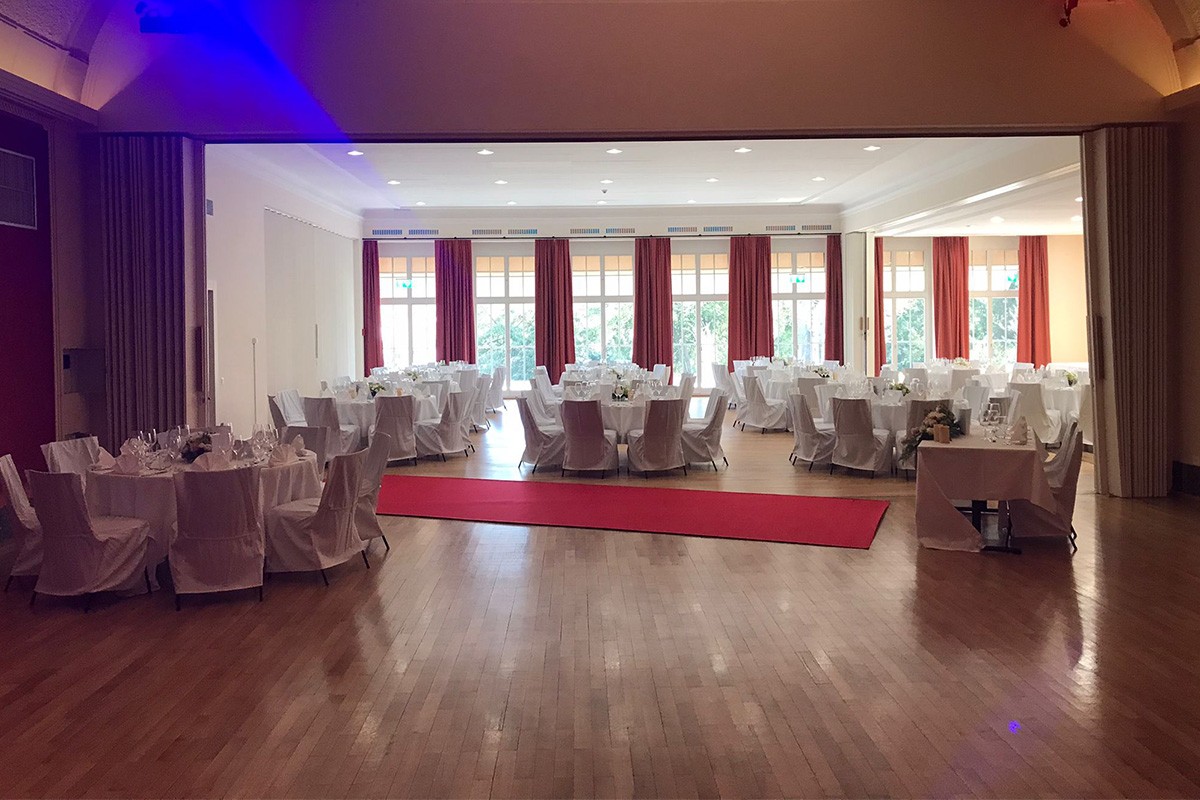 Das flexible Raumkonzpet mit 4 klimatisierten Sälen, Bühne und Foyer ermöglicht die Einrichtung von kleinen bis zu grossen Sälen, von 20 bis 400 Personen, abgestimmt auf Ihre Wünsche. Bei schönem und warmem Wetter eignet sich die grosszügige Terrasse für den Hochzeitsapéro.